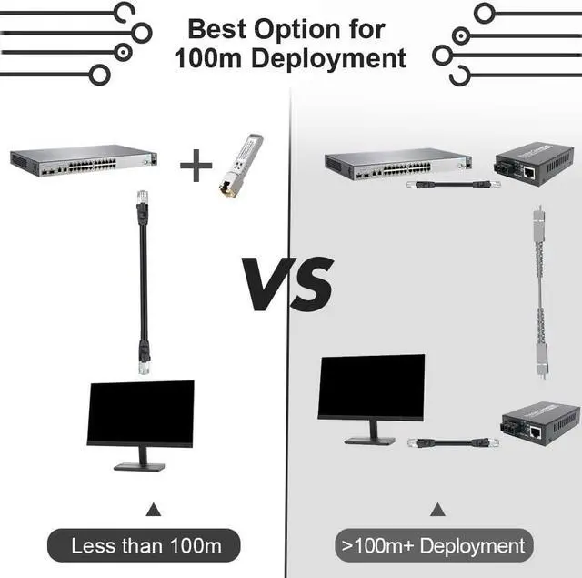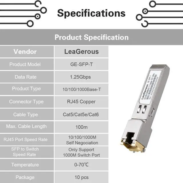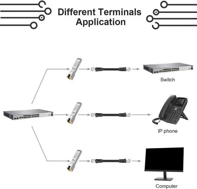 Max 100m Deployment the RJ45 SFP copper module supports upto 100m cat5/cat5e/cat6 max cae length, which is best option for short distance cae deployment.