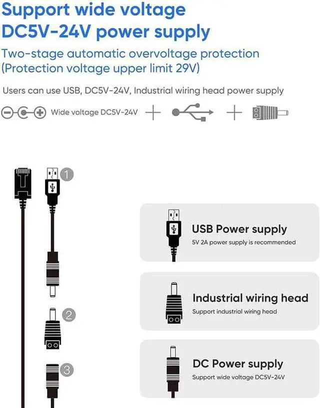 Power &a; Parameters Wide voltage DC5V-24V power supply (typical 5V/2A or 12V/1A, ripple less than 100mV), two-stage automatic overvoltage protection (protective voltage upper limit 27V), optional USB or DC power supply mode; 1 mounting kit and 1 industrial DC connector, more suitae for industrial applications;
