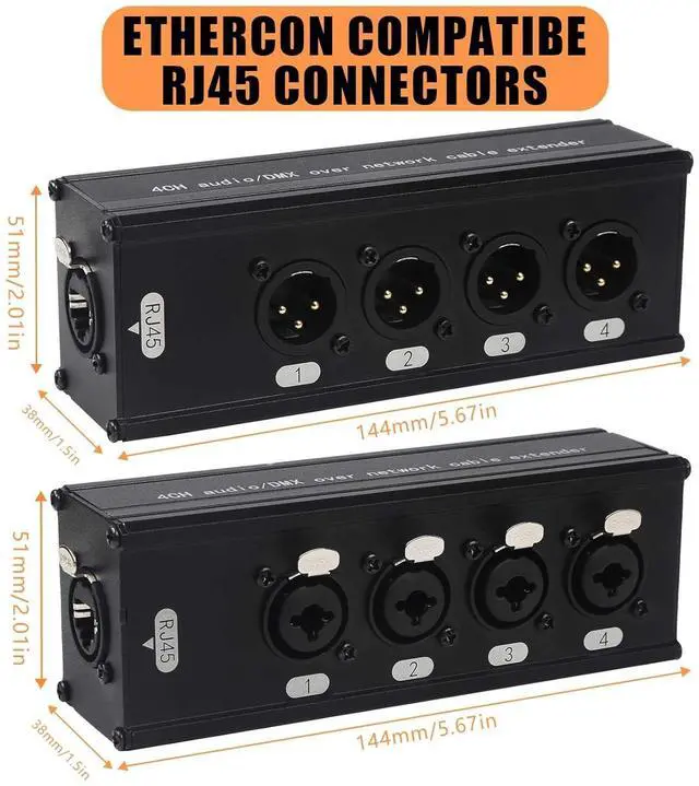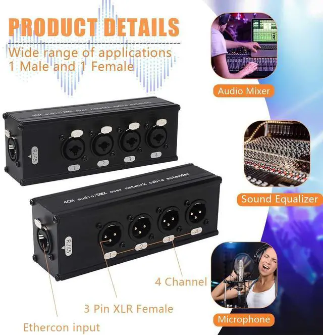 Elevate your audio setup with this professional 4-channel XLR-to-Ethernet tender. Dgned for demanding environments, it replaces heavy multi-core caes with a single Cat5/Cat6/Cat7 network cae, enaing seamless signal transmission up to 100+ meters. The gold-plated XLR connectors ensure corrosion-free durability, while the Ethercon adapters provide rugged protection for stage use. Whether youre a touring musician, studio engineer, or technician, this tender guarantees noise-free audio, effortless setup, and reliae performance.