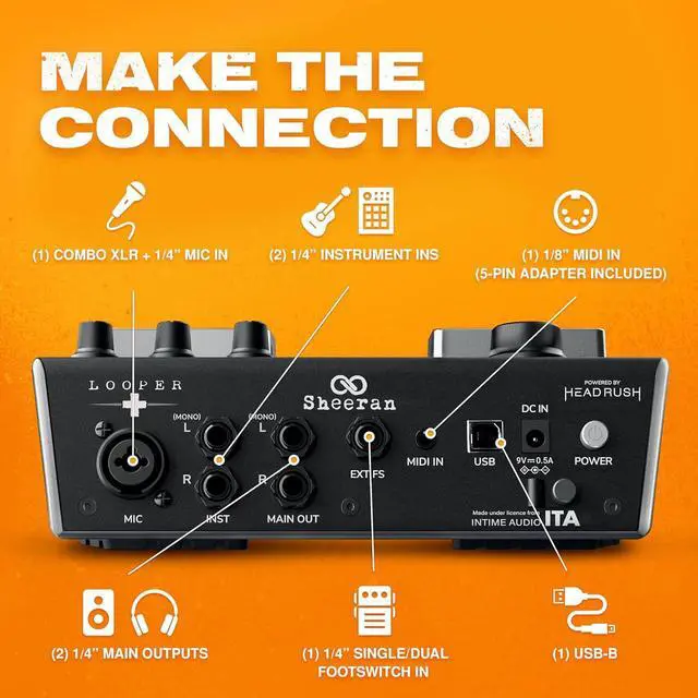 Well Connected - Microphone In, Stereo Pair of 1/4" Instrument Ins, Stereo Pair of 1/4" Main Outs, 1/4" Single or Dual Footswitch In, 1/8" MIDI In, USB-B for Audio, MIDI and Loop File Transfer