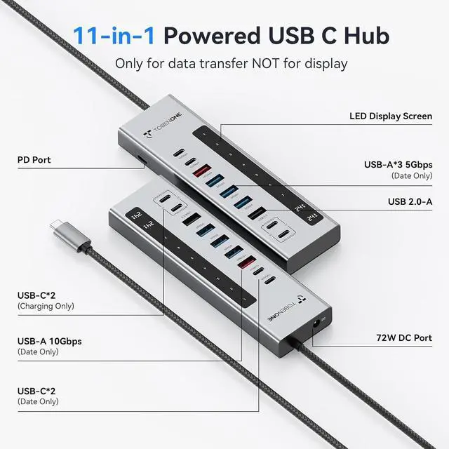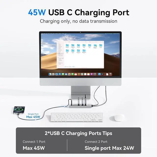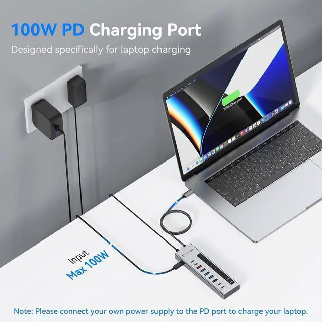 USB-C PD-IN Port: This USB C Splitter adds a USB C PD charging port specifically for laptop charging, breaking the limitation that the hub can't be charged witt a laptop, and accepts 100W power input and outputs with no pre-fastened power