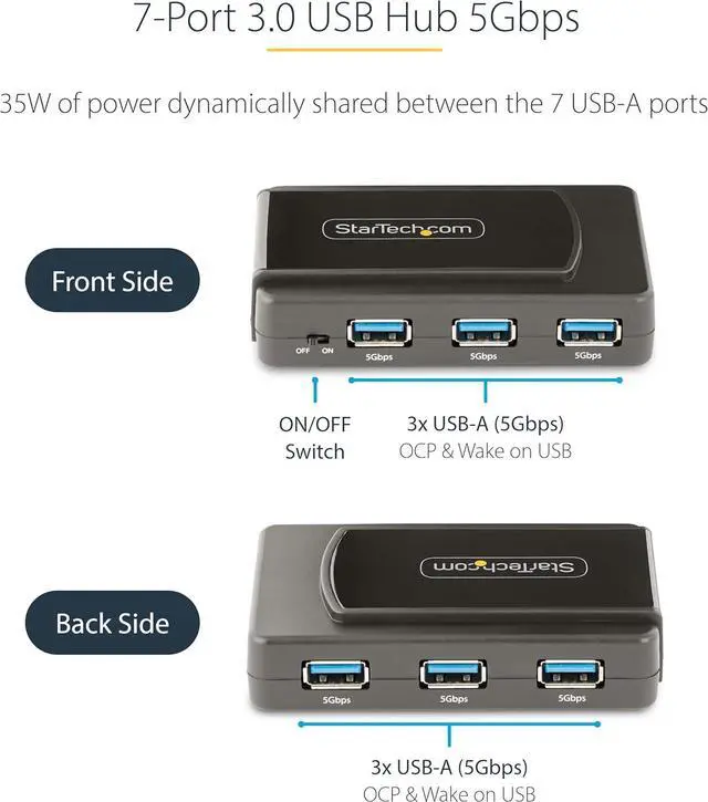 This 7-Port USB 3.2 Gen 1 (5Gbps) hub adds seven USB Type-A ports to a couter, with the added benefit of a dedicated on/off switch. The USB hub is self-powered with an included power adapter, making it ideal for a fixed workstation setup. Add Seven USB-A Ports The USB 3.0 hub pands your laptop or desktop couter's USB connectivity, adding seven USB ports. It is backward coatie with USB 2.0, ensuring support for a wide range of USB devices such as thumb drives, HDDs/SSDs, mice, keyboards, webcams and USB headsets. Power & Charge The USB hub is self-powered, using an included power adapter. It includes one fast-charge port that supports BC 1.2, providing 1.5A ( 7.5W ) of power. It also supports CDP (Charging Downstream Port) applications. Plug-and-Play The 7-Port USB Hub is OS independent, supporting all operating systems (Windows, macOS, ChromeOS, iPadOS and Android), and installs automatically when connected to a couter. Enhance Productivity and Device Management with the. com Connectivity Tools Application Developed to irove performance and security,. com Connectivity Tools is availae for download with this product.