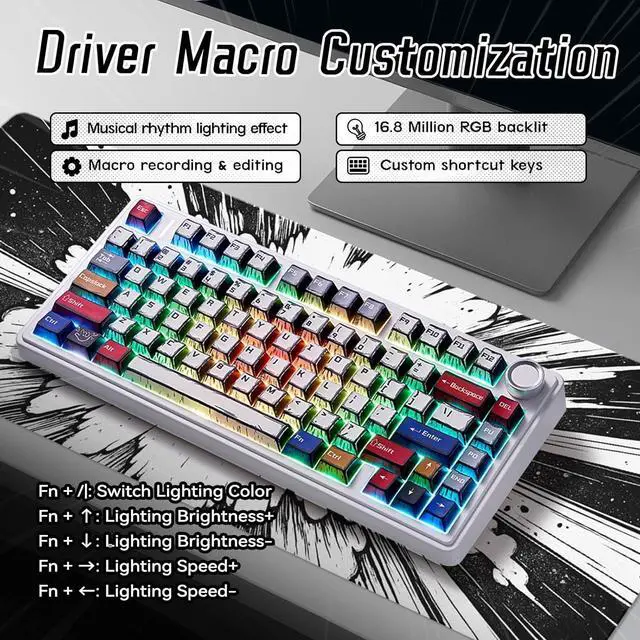 Dynamic Rgb Backlit Keyboard: F75 light up led keyboard features 16.8 million RGB lighting colors and 16 lighting effects, you can change the color, brightness and speed by the knob or FN key combination, creating a desktop atmosphere to fit your mood