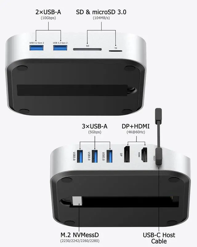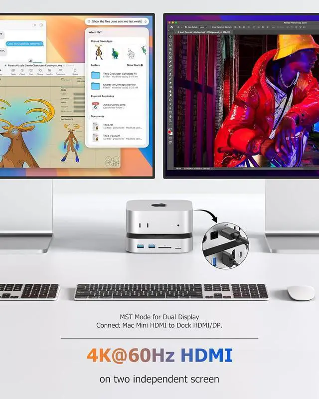 [MST Mode and Mirror Mode for Dual Displays] Easily set up dual displays with tended Mode by connecting the Mac Mini HDMI port to the first display and using the docks HDMI/DP port for the second display, creating a larger workspace with 4K at 60Hz on both screens. Alternatively, enae Mirror Mode by connecting both displays to the docks HDMI and DP ports, displaying identical content on each screen at 4K at 60Hz.