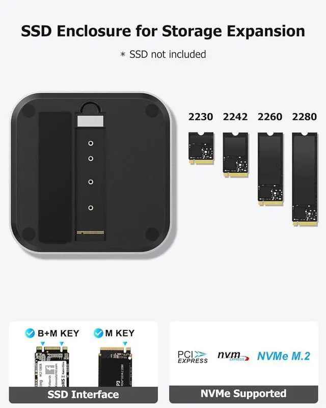 [Up to 8TB NVMe Storage pansion] Enhance the storage of your Mac Mini M4/M4 Pro with M-Key and B+M Key NVMe SSDs up to 8TB. Achieve 10Gbps data transfer speedsideal for 4K video editing, large file backups, and demanding workflows. (SSD not included)