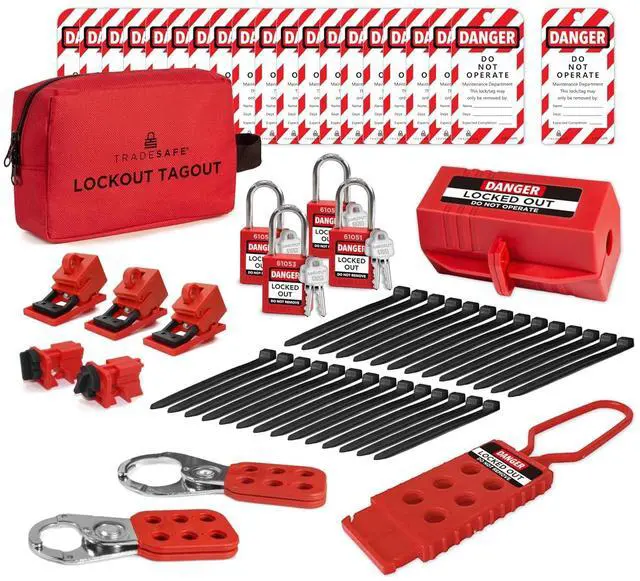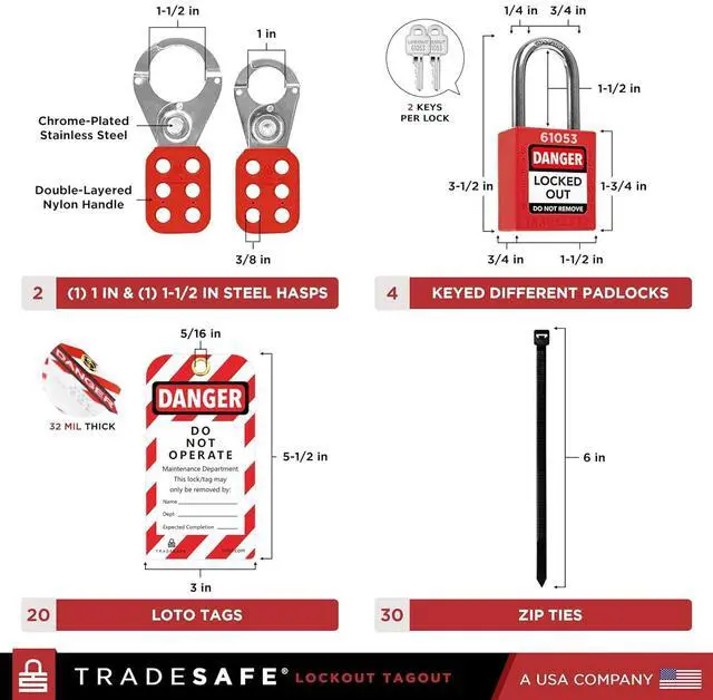 LOTO hasps &a; Lockout Tags - (2) group lockout hasp with chrome-plated steel jaw and industrial-grade nylon-coated handle, (1) non-conductive polypropylene electrical hasp; (20) 32-mil weather-rstant PVC vinyl danger do not operate tags, seamless notation using permanent markers or wax/grease pencils, (30) nylon cae ties