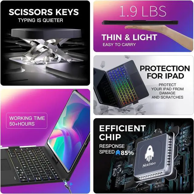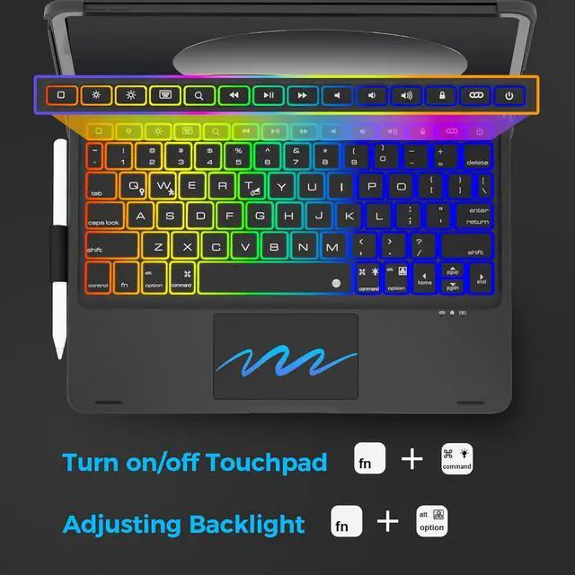 7-Color BacklitThis keyboard for ipad 10th generation features a rainbow backlit. iPad 10th generation case with keyboard has 3 adjustae brightness levels, allowing you to customize the backlight brightness according to your personal preferences and ambient lighting conditions. Whether you're using it in a dimly lit room or a brightly lit space, this feature will provide you with a more enjoyae typing perience when using the 10th gen ipad case with keyboard.