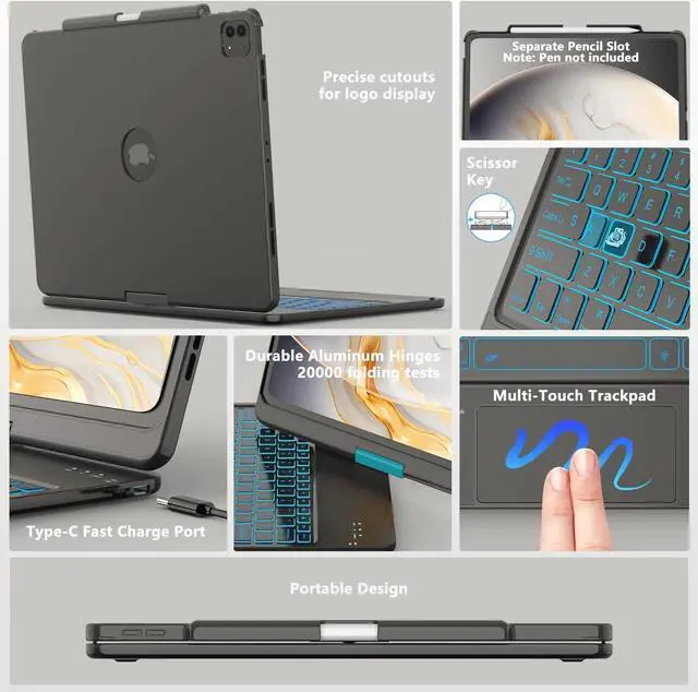 Multi-Angle Usage Mode: This for iPad Air 13 inch case keyboard features 360 swivel and 180 flip, Durae Aluminum Hinges 20, 000 folding tests, which allows you to easily adjust the screen to any angle, anytime, anywhere, from typing notes, watching a movie, to sharing a presentation document, you can easily swivel to adjust the angle to Share a comfortae view from different angles