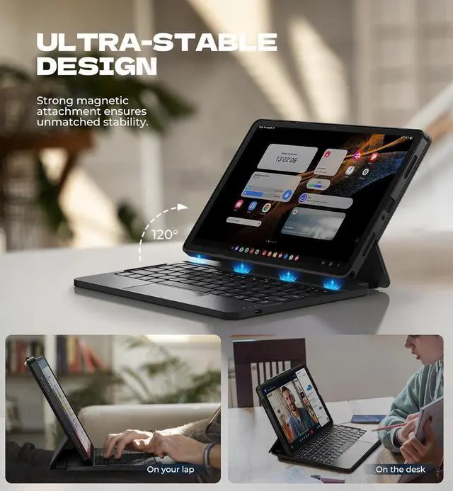 [Rock-solid Magnetic Support] With strong magnets embedded in the slot, the PC case with taet inserted in will be securely and firmly attached to the keyboard case, providing a rock-solid support on your desk and even on your lap. The ergonomic 120 degree viewing angle ensures a maximum comfort for study, work and entertainment.