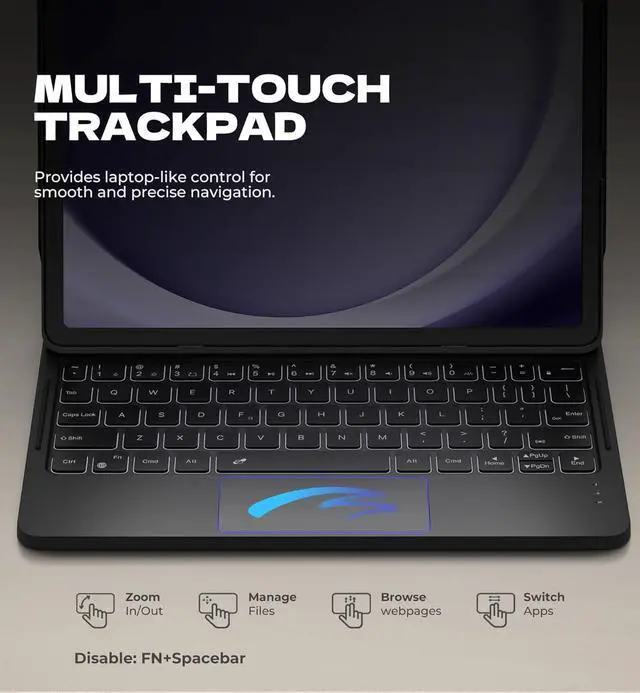 [Keyboard Case with Multi-touch Trackpad] Enjoy smooth, and precise navigation with the built-in trackpad. It supports multi-finger gestures, giving you laptop-like controls on your iPad for editing documents, browsing the web, multitasking, and more. You can disae it to prevent palm rejection by pressing FN and spacebar.