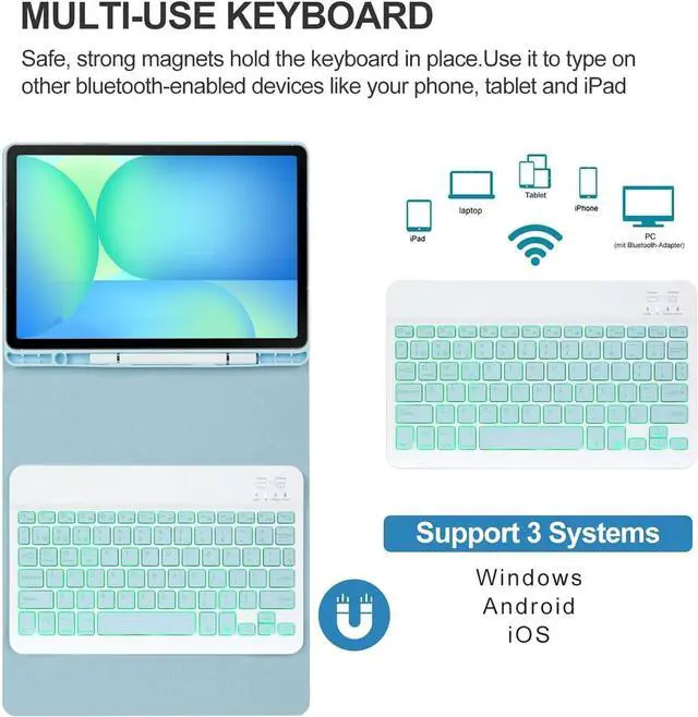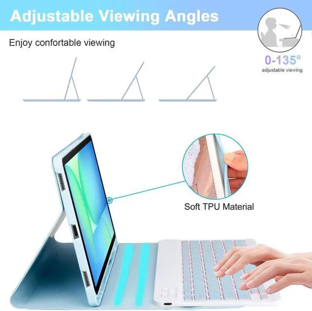 Adjustae Viewing AnglesThe protective for Galaxy Tab S10 Lite/S10 FE/S9 FE 10.9 ''/Galaxy Tab S9 11'' case Keyboard transforms into a versatile stand, offering multiple viewing angles in landscape mode. Whether typing, watching movies, or video calling, easily find your ideal angle for optimal productivity and comfort.