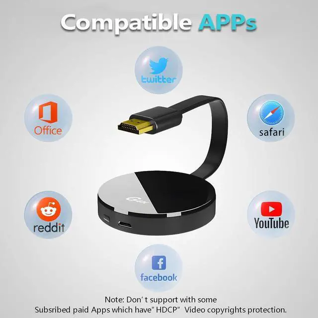 Note on HDCP-Protected AppsPlease note: Due to "HDCP" video copyright protection, it does not support streaming from certain paid apps like Netflix, Prime Video, Hulu, BT Sport, and similar services.