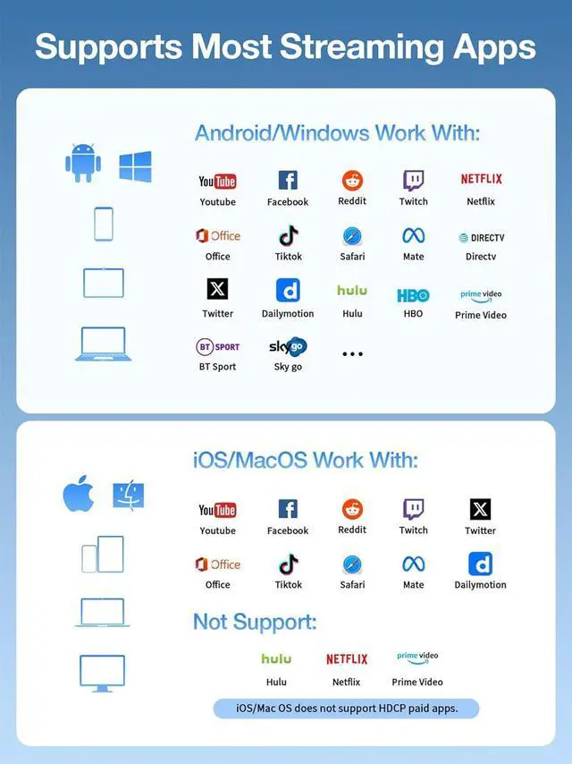 Wide CoatibilityOur wireless airplay adapter is coatie with most systems like iOS, Android, macOS, and Windows, including i-Phone, i-Pad, MacBook, Sam-sung, Goo-gle P-ixel, etc. It supports common wireless protocols like AirPlay, DLNA, Cast, and Miracast. Supports any video apps on Windows&Android, such as Netflix, Prime Video, Hulu, Vudu, HBO go. For iOS&macOS users, you can mirror most apps such as TikTok, Facebook, Twitter, Instagram, Youtube, Kodi, Skype, etc. cept HDCP-protected apps.