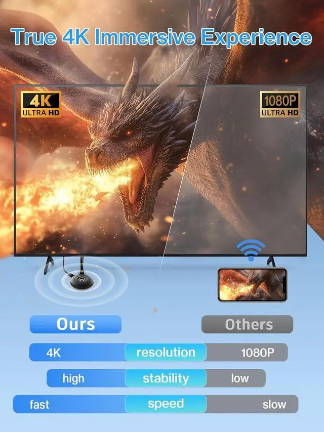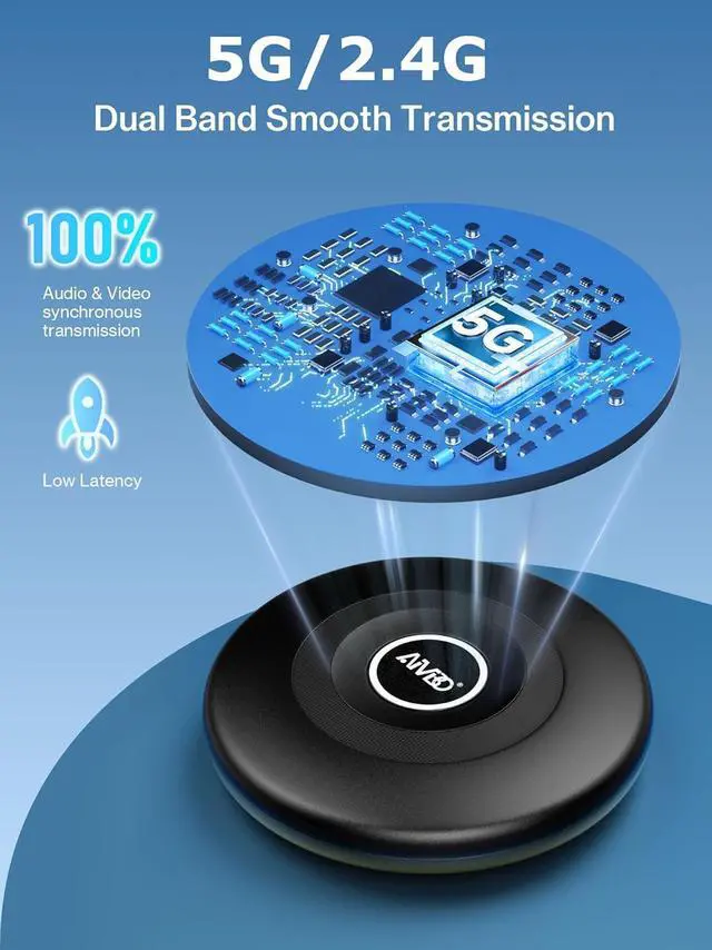 Portae and PracticalWith a lightweight and coact dgn, this screen mirroring adapter weighs a mere 0.05 lbs. It's so portae that you can easily slip this wireless HDMI display dongle into your pot or briefcase, making it an ideal mobile presentation tool. Furthermore, Wireless HDMI Dongle Adapter with slim, circular body features evenly distributed heat dissipation holes on the back ensuring consistent transmission performance even with time use.