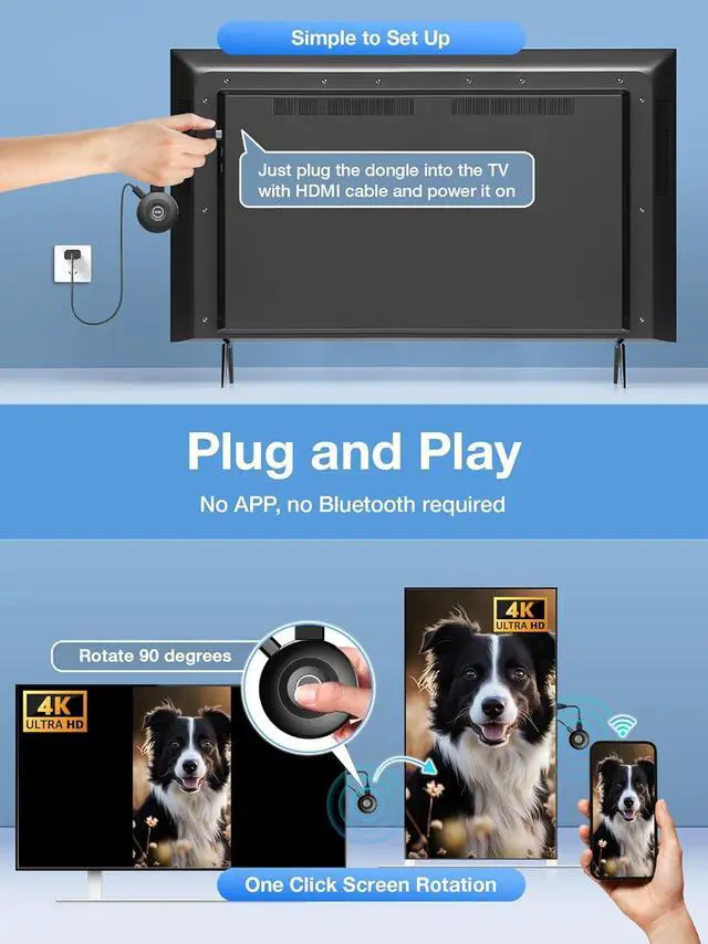 Plug and Play SilicityJust plug the wireless display dongle into the TV and power it on, locate the mirroring function on your phone, and you can effortlessly achieve wireless screen mirroring witt the need for manual, apps, or uetooth. Moreover, a single click can easily switch between horizontal and vertical screen orientations, catering to your diverse display needs, such as watching movies on the horizontal screen and browsing photos, documents, and short videos on the vertical screen by the button in the middle of the miracast adapter.
