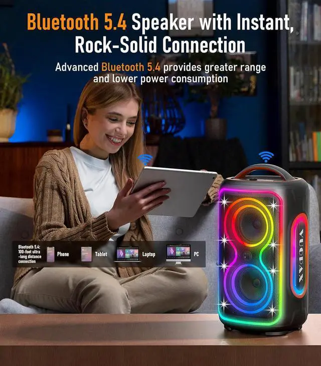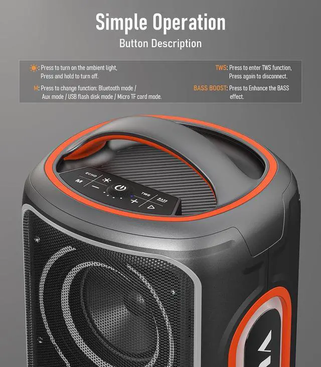 : Adopting the latest uetooth 5.4 technology, it offers faster, more stae connections and longer transmission distances. In addition to wireless connection, it also supports interface input methods such as AUX, USB, MIC, and TF card, making it easy to connect your TV, game console, microphone and other devices, meeting your access needs for various entertainment scenarios
