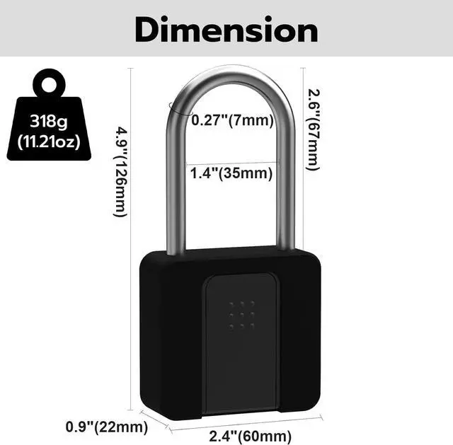 USB C RechargeaeThe electronic padlock have lower power consution and longer standby time. The USB C rechargeae 160MAH lithium battery can support up to 6-month of standby time. When out of battery, the smart lock will remain lod, recover by connecting to a power supply, or using keys to unlock. (Including USB C Cae