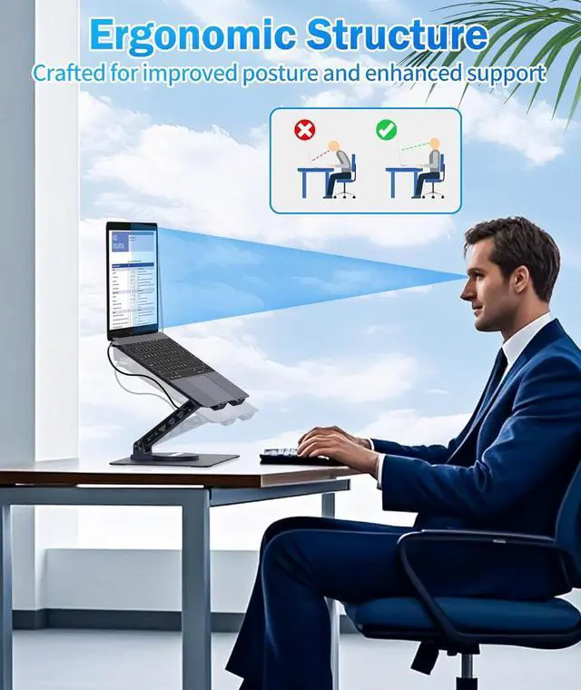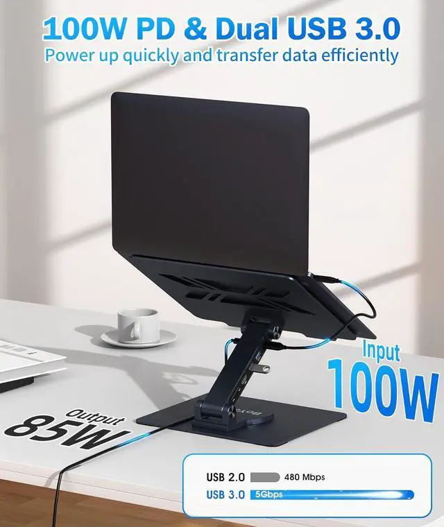 Ergonomic & Cooling Dgn This laptop dock stand unfolds into a stae laptop stand, elevating your device to an optimal viewing angle, reducing neck and slder strain for comfortae long-term use. The aluminum alloy construction enhances heat dissipation, effectively lowering device teerature and ensuring stae performance.