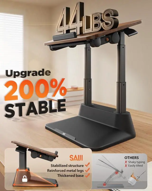 Elegant Wooden Taetop Our desk laptop stand features a walnut toned desktop that pairs perfectly with its durae aluminum structure, ensuring a perfect balance between style and functionality. Unlike bulky metal couter stands, ours is lighter and easier to move around. Whether you're working from home or in the office, this stand is an cellent choice for you