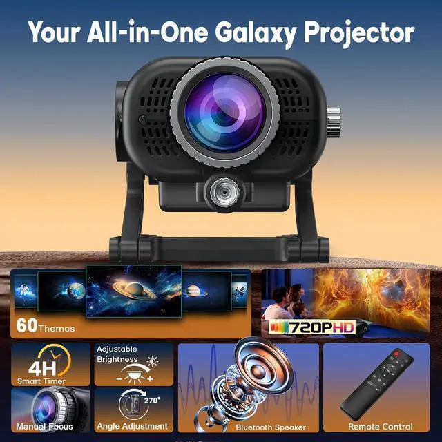 Effortless Remote Control & Flie Bedroom Setup: Adjust every function from the comfort of your bed with the included remote. This galaxy projector for bedroom environments and versatile space projector easily switches modes, sets timers, or modifies brightness witt moving. The adjustae dgn ensures perfect positioning in any room layout