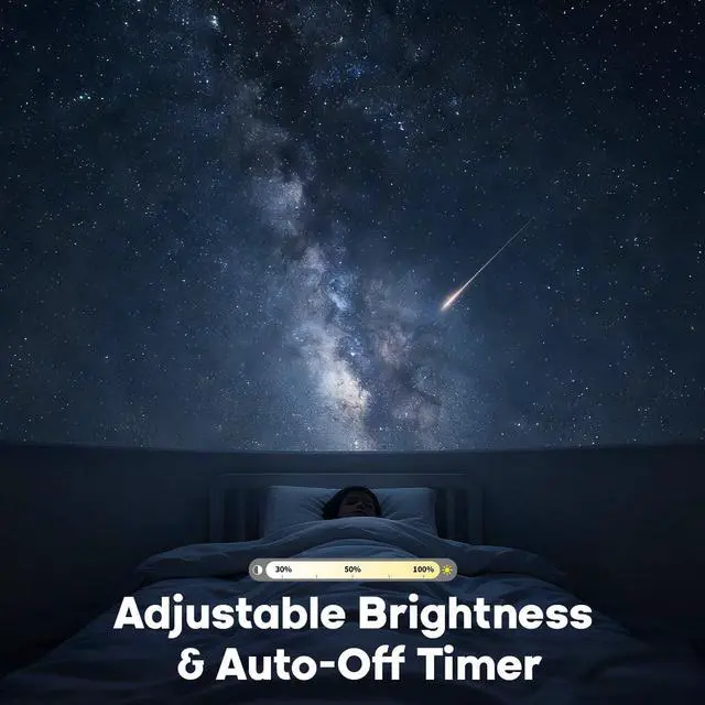 Bedroom Ambiance: Set your preferred auto-off timer (1H/2H/4H) for worry-free sleep. The ideal star projector for bedroom use, its 4-level dimming galaxy light projector allows you to create just the right ambiance, from soft night light to vibrant star show, all while being gentle on the eyes