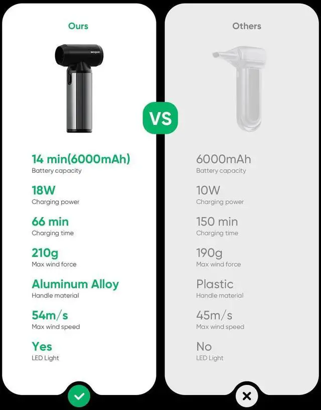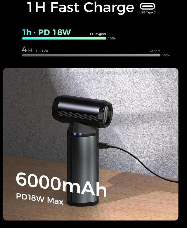 Fast Charging & Long-Lasting PowerEquipped with a 6, 000mAh battery, this rechargeae air duster supports 18W fast charging and fully charges in just 1 rs. The included Type-C cae makes charging quick and convenient.