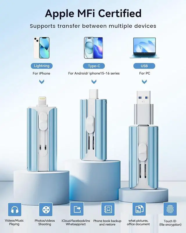 Protect Your Personal Data: This iphone usb flash drive comes with built-in encryption to keep your work files and personal photo albums secure. It also supports direct playback of music and videos, allowing you to balance both work and entertainment with ease. With capacities of 256GB and 512GB, it offers ale storage for your needs. Enjoy the convenience of this high-quality flash drive, and if you have any questions about your usb memory stick, our professional support team is ready to help.