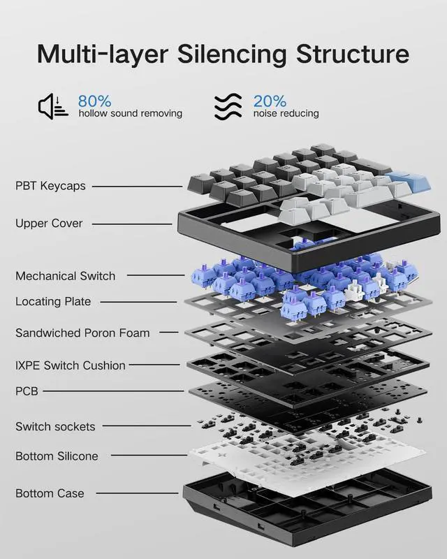 Multi-layer Silencing StructureDgned with your comfort in mind, all of s keyboards feature a multi-layered cushion to make typing easier on your fingers. The Poron bottom layer, combined with the sandwich foam and IXPE switch pad, it makes every keystroke feel consistent and the sound is much more pleasant. If you are a mechanical keyboard lover, youll love the sound this keypad makes.