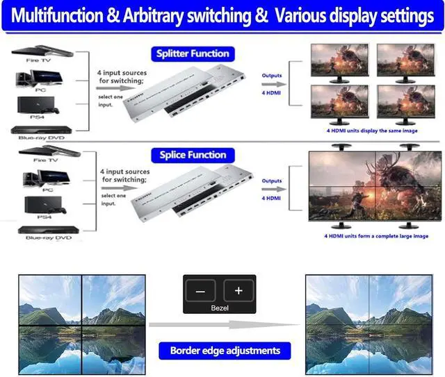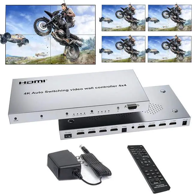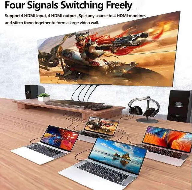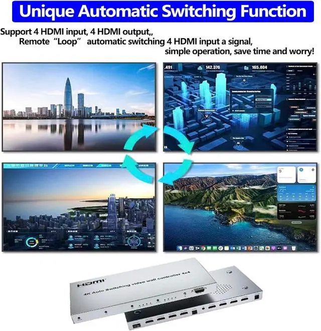 Supports Auto switching This 4K video wall controller 4x4 device Support Auto switching. 4-channel HDMI input source, support automatic switching 4-channel HDMI input one kind of signal, save time and irove work efficiency!