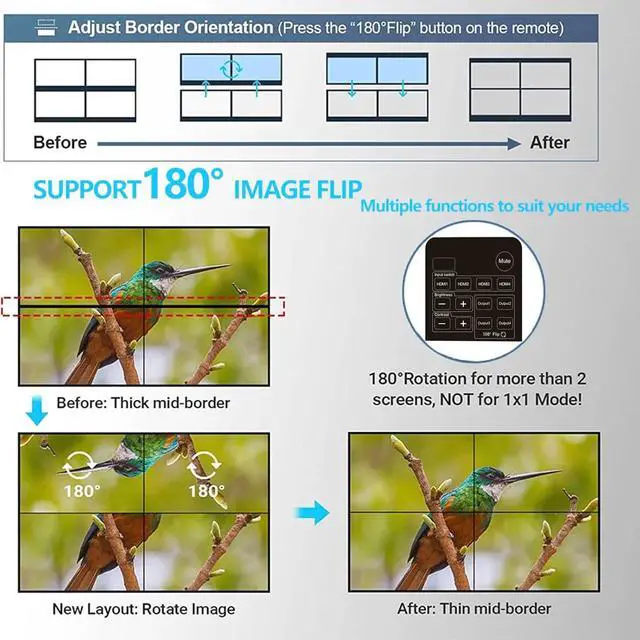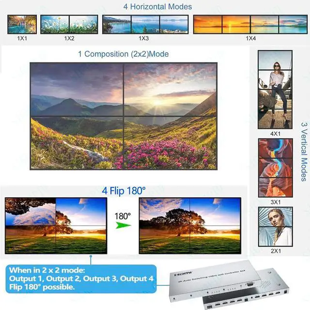 Supports image 180 degree FlipsThe 4K auto switching TV wall controller 4x4 Supports output image flip 180 °. in the remote control, corresponding to the output 1, output 2, output 3, output 4, 180 ° flip button, so easy to solve the proem of the monitor hanging upside down and affect the screen. (Note: 180° flips is only availae for more than 2 screens, not for 1x1 mode! )