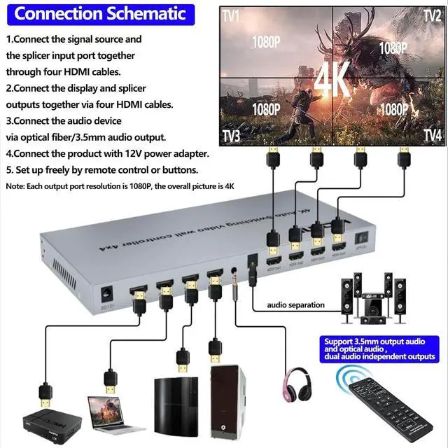 Dual audio outputsThis 4K 4x4 auto switching splicer Supports 3.5 mm audio output and optical audio output, dual audio separation, independent output, bring you rich listening effect!