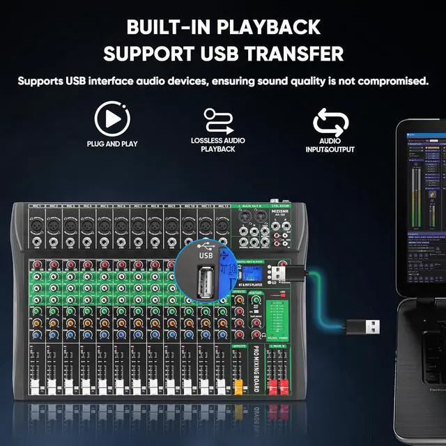 Noise-Free Performance: Built for clarity, this mixer features gold-plated XLRs, balanced line inputs, ensuring ultra-low noise levels. The +48V Phantom Power Supply supports wired, wireless, and condenser microphones as well as instrument connections, guaranteeing professional-grade audio quality every time.