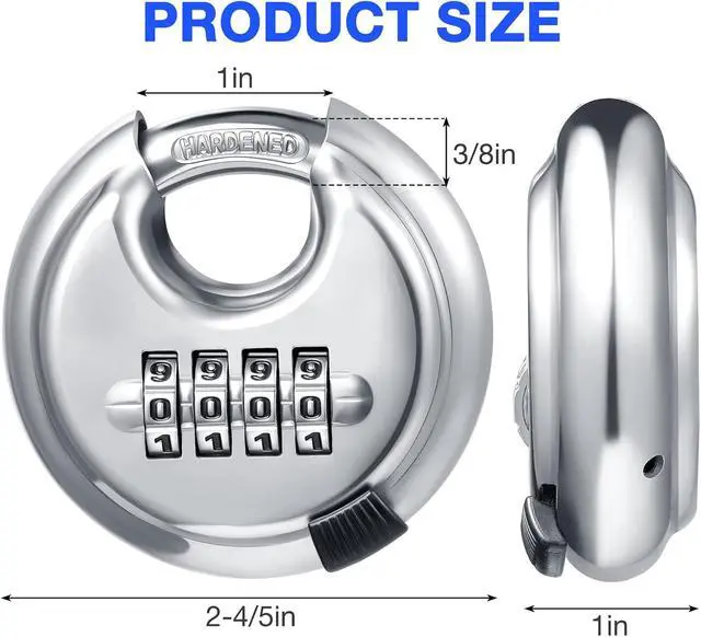 Widely Application: This 4 digital disc padlock dgn with high-security combination padlock is constructed with stainless steel, anti-rust, anti-corrosion, and anti-freeze, suitae for indoor and outdoor use, such as storage unit lock, garage lock, shed lock, trailer lock, outdoor gates lock, wareses lock, logistics lock, doors lock, and moving truck lock, etc.