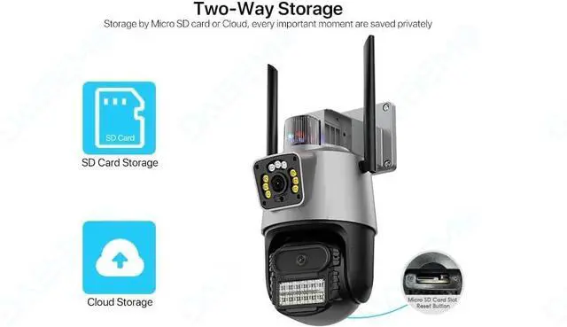 -: Coared to traditional single-lens, single-screen security cameras, our dual-screen security camera can capture more details from all angles. Coared to ordinary zoom dual-screen cameras, our dual-screen security camera can capture more scenes and areas. Additionally, we offer both wireless WiFi connection and wired Ethernet connection options to enhance network stability.