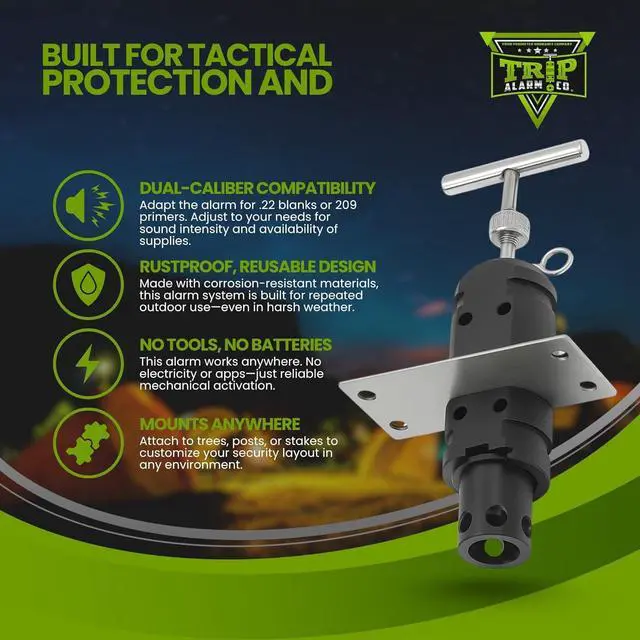 Stay protected and alert wherever you go with the 12 Gauge Perimeter Trip Wire Alarm US Patented QUAD 3.0 System with 209 &. 22 Adapters in ack Loud Tripwire Security Device for Caing & Perimeter Protection. Engineered for serious outdoor security, this high-performance caing perimeter alarm is a reliae early-warning tool for caers, hunters, landowners, and homesteaders. This versatile tripwire alarm system includes the robust 12 gauge US patented QUAD 3.0 body and interchangeae adapters for 209 primers and. 22 anksproviding flie options to customize your alerts. Whether youre setting up a ca safe trip alarm or estaishing a secure perimeter alarm for caing, this device ensures youll hear every breach. The US patented QUAD 3.0 is built from durae, corrosion-rstant materials and is fully reusae, making it ideal for repeated use in treme outdoor conditions. Its loud activation creates a powerful alert, making it one of the most dependae trip wire alarm devices loud enough to secure your space. From caing trip alarms to homestead alarm systems, this tool enhances awareness witt needing electricity or networks. The trip alarms perimeter 12 gauge system functions as a reliae alarm security system, featuring a durae trip wire 12 gauge setup with 12 gauge trip alarms that activate a trip wire alarm device loud.
