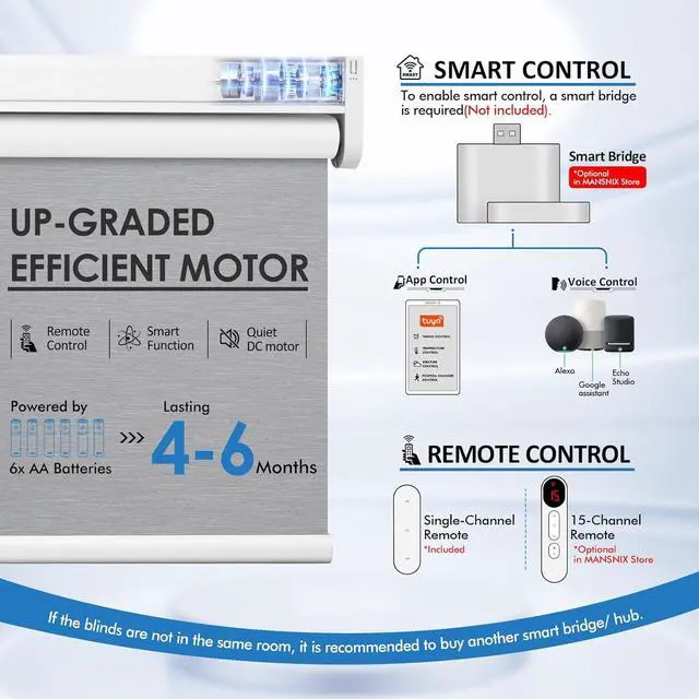 Wireless & Smart Control: Our motorized window shades includes a 1-channel remote for cord-free, child-safe operation. You can upgrade the smart inds with an optional 15-channel remote for group control or an optional hub for app/voice control.