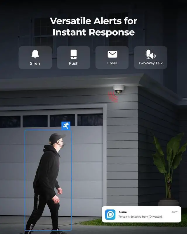 VARIOUS RECORDING OPTIONS: This camera enaes multiple-user access, smart playback, and two-way talk for enhanced surveillance capabilities. Recordings can be conveniently stored on microSD card, NVR, FTP, or NAS, utilizing H. 265 high-efficiency video coression for optimized storage efficiency. (Note: The PoE NVR/switch/injector and DC power adapter are not included. )