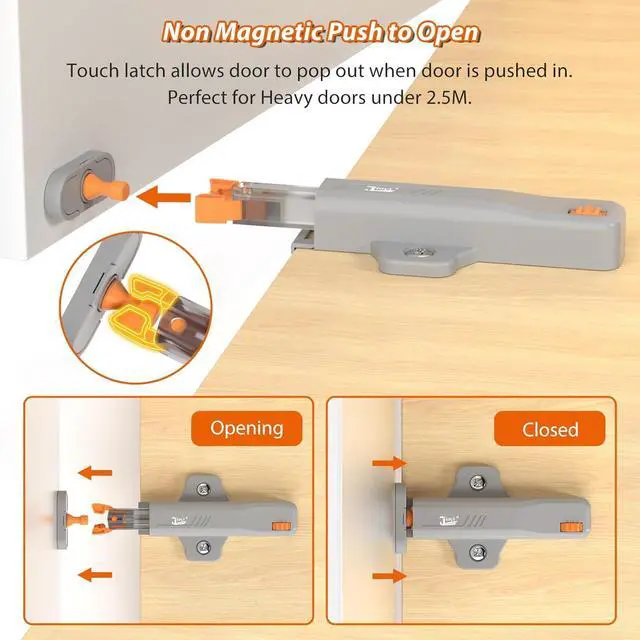 Powerful Spring: Adopting a stronger heavy-duty spring mechanism, allows 40N of elasticity for the push in release. The non-magnetic push to open door latch is strong enough to easily keep doors closed. Keep your belongings concealed and secure with this push release latch that's perfect for using on hidden doors, drawers, and even RV closets and even for heavy doors under 8 Ft.