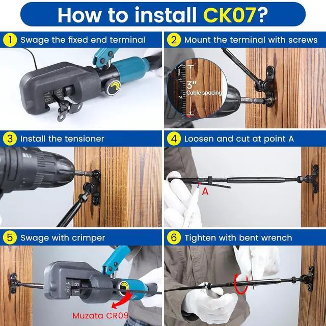 Advice for constructing a system: To help you build a cool-looking Woodack cae railing system more efficiently, we recommend the following product combinations from, including 1/8" ack toggle turnbuckle CK07, ack angle protector sleeve CR70, ack level protector sleeve CR88, ID-1/8" vinyl coated ack wire rope WR22, hydraulic crier with cae cutter CK12, drill guide CT24