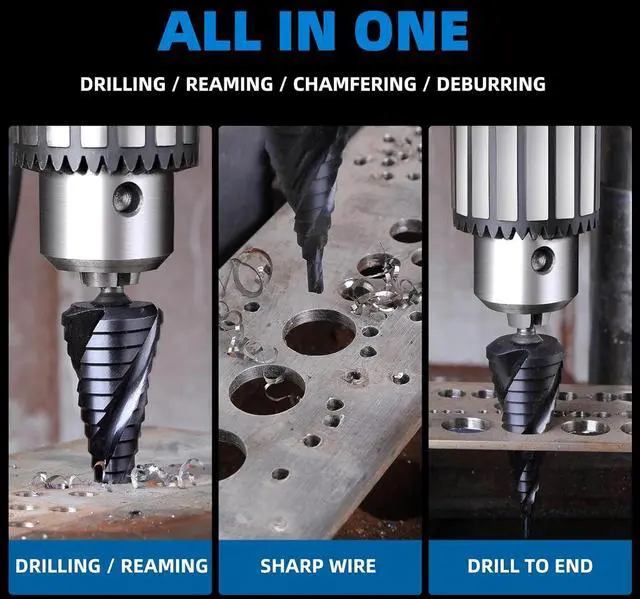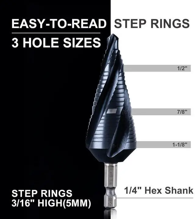 Size: Includes from 1/2" to 1-1/8". Popular Size 1/2", 7/8", 1-1/8" labeled, step drill bit for metal can make multiple holes of different diameters in materials such as stainless steel, aluminum, wood, plastic sheets, etc