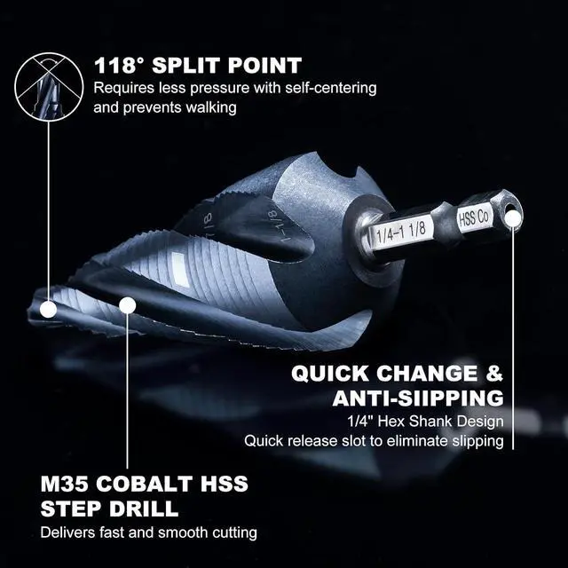 Four Spiral Flute Cobalt Step Drill Bit,1/4"-1-1/8"Iact Unibit Pro Max Step Bit Set,1/4" H Shank M35 for Metal Carbon Steel, Stainless Steel, Wood, Plastic