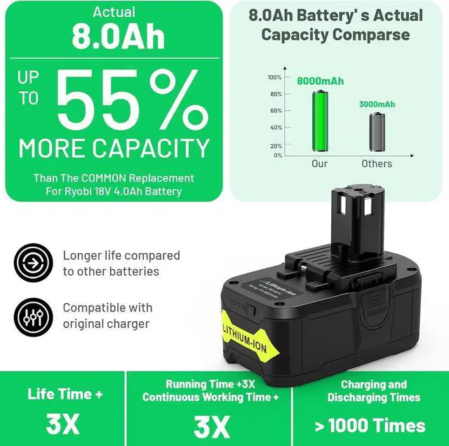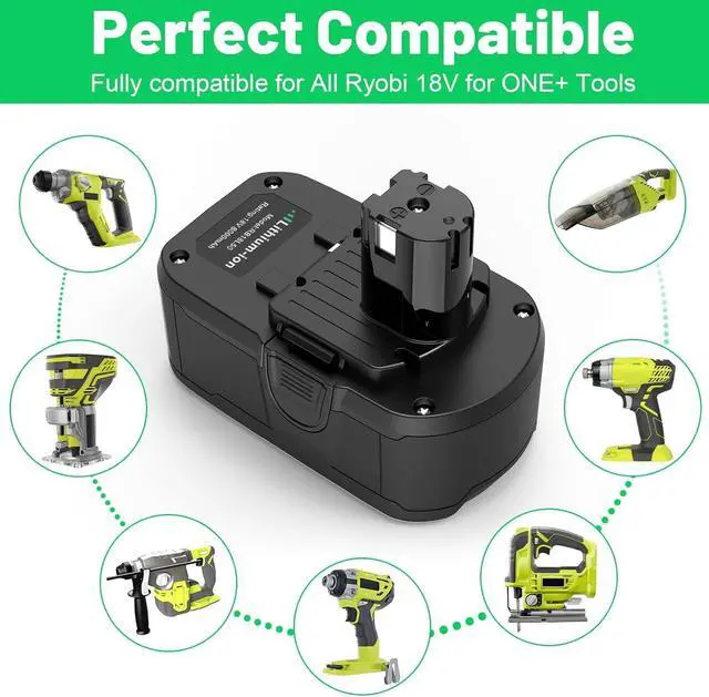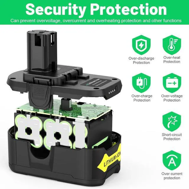 SAFE & RELIAE: Replacement for Ryobi battery 18V is with Built-in integrated microchip, will prevent overcharging, self-discharge, overcurrent protection, short circuit protection and lengthens battery life