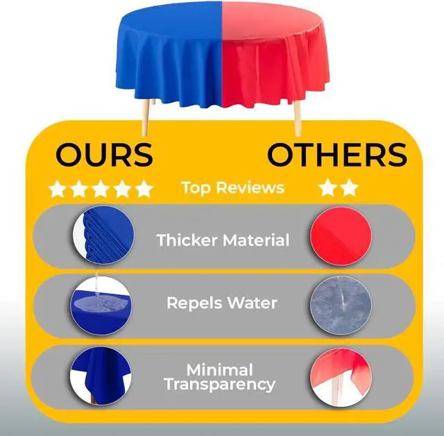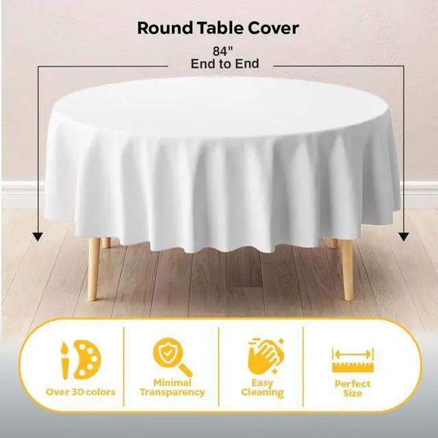 Easy Clean Up: Say goodbye to laundry with these White disposable tableclothsjust cover your table, celebrate and toss when done. Ideal for large events, each White plastic table cloth helps reduce cleanup time while keeping your table spotless. Great plastic tablecloths for round tables for any host in need of easy-to-use party supplies.