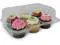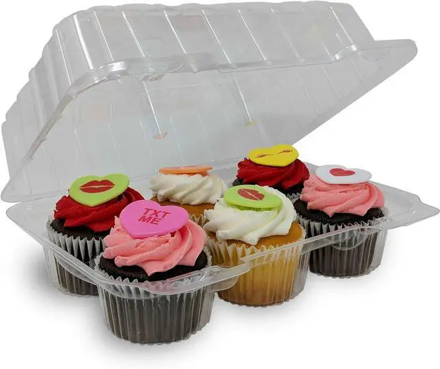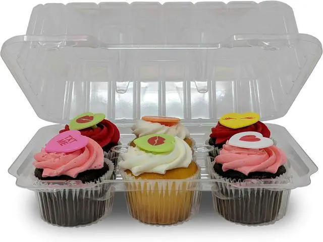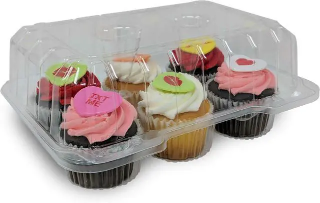 Put your baked goods on display with the clear OPS plastic 6-cup high dome hinged cupcake and muffin container. A high dome lid ensures taller baked goods and baked goods piled on frosting wont be smushed. This container is clear from top to bottom allowing you to display your baked good to generate easy sales without ever having to open the container! The ideal way to sell cupcakes in-house or pre-packaged items for customers to take home.