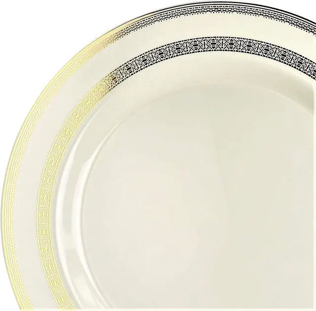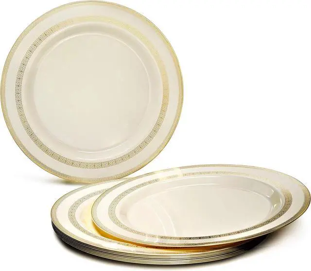 " OCCASIONS " 240 Plates Pack, Heavyweight Premium Disposable Plastic Plates Set 120 x 10.5'' Dinner + 120 x 6.25'' Dessert/Cake Plates (Lace Ivory & Gold)