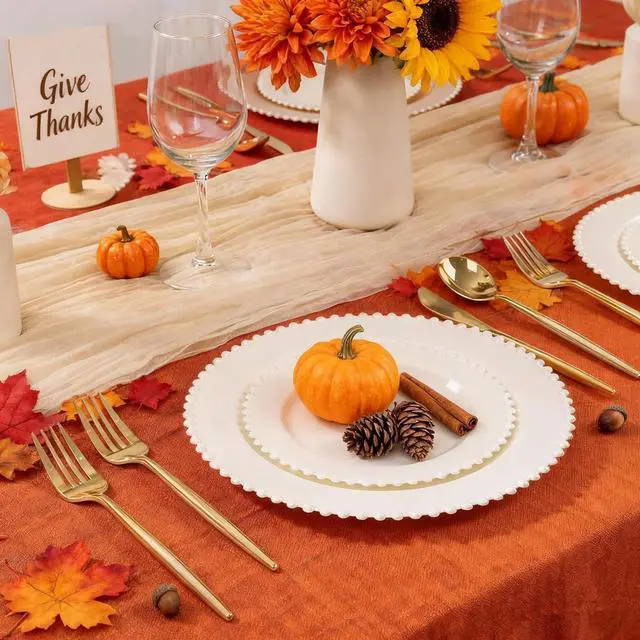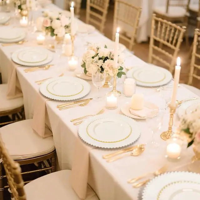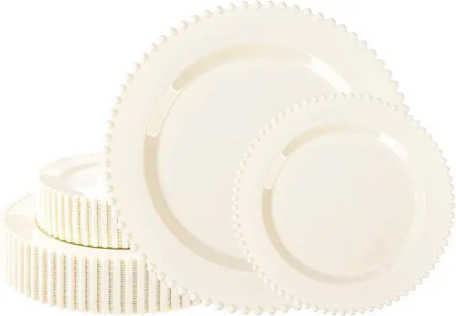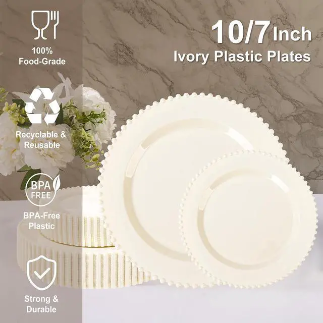 Premium & Versatile: Our beaded plastic party plates are crafted with food-safe, durable plastic that withstands both piping hot dishes and chilled desserts. Reusable for multiple events yet disposable when convenience calls.