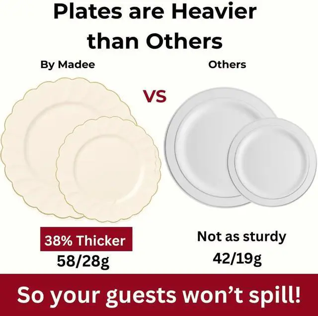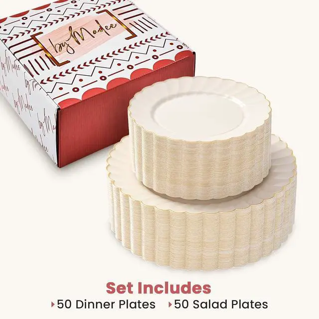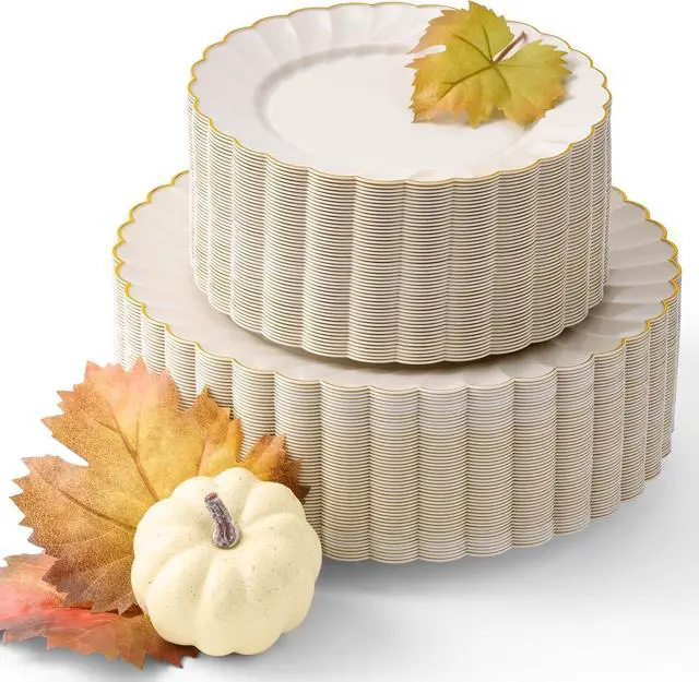 Host with elegance this fall with s HEAVYWEIGHT 100-piece ivory scalloped plates set trimmed in gold. This set includes 50 dinner plates and 50 dessert plates designed thicker and sturdier than standard disposables. Perfect for Thanksgiving, Friendsgiving, and fall ings, yet versatile enough for weddings, showers, and anniversaries. With timeless style and superior strength, makes hosting beautifully simple.