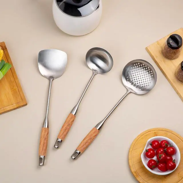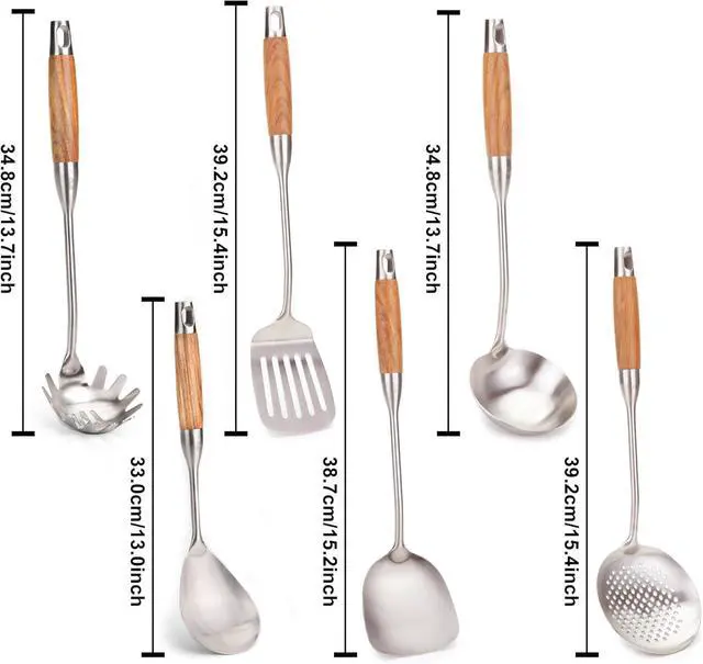 WOK UTENSILS The perfect compliment to any wok, cast iron wok, Fits Long Wooden Handle 304 Stainless Steel Utensils, The sleek lines left a deep impression. The comfortable grip is great. The length of the handle is long enough so that you don't slip into the pot. The end can be hung. Fashionable appearance