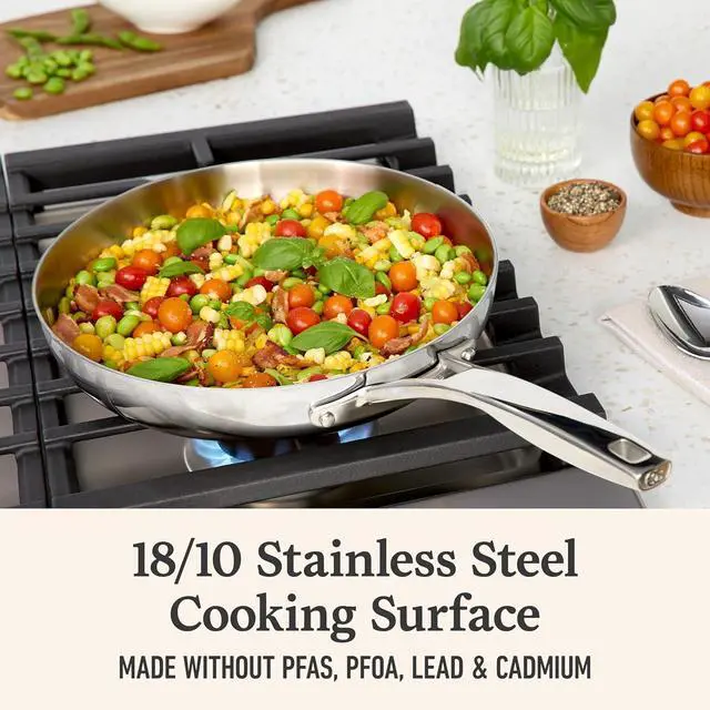 Designed for home chefs who value quality and performance, the Premier Stainless Steel 10" Fry Pan is built for precision cooking and lasting durability. Engineered with ultra-durable, non-toxic, 5-layer construction and heat-responsive aluminum core, this pan features Turbo Temp technology and heats up to 30% faster, so you can getting cooking faster. * Whether you're whipping up delicate sauces or creating the perfect sear, this frying pan delivers flawless results for crowd-pleasing meals. The brushed stainless steel finish adds a professional touch to your kitchen, while its oven-safe, all-stovetop compatibility ensures effortless cooking from start to finish. Cook with ease and bring restaurant-quality performance to your kitchen with Premier Stainless Steel cookware. (* Premier Stainless Steel vs. Professional Series Stainless Steel)