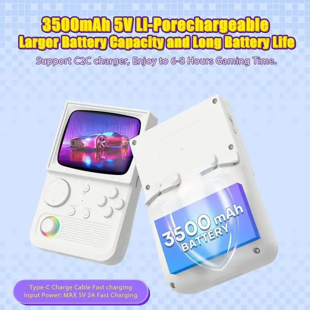 Portable Retro Gaming Console and Long Battery LifeRetro Gaming Console with Portable Case easy to take, Enjoy up to 6-8 hours of continuous gameplay with the 3500mAh battery. Its speakers sound great, and the 3.5 mm jack offers private immersion, Includes a Type-C charging cable and user manual for convenient charging and guidance on the go, relish uninterrupted fun.